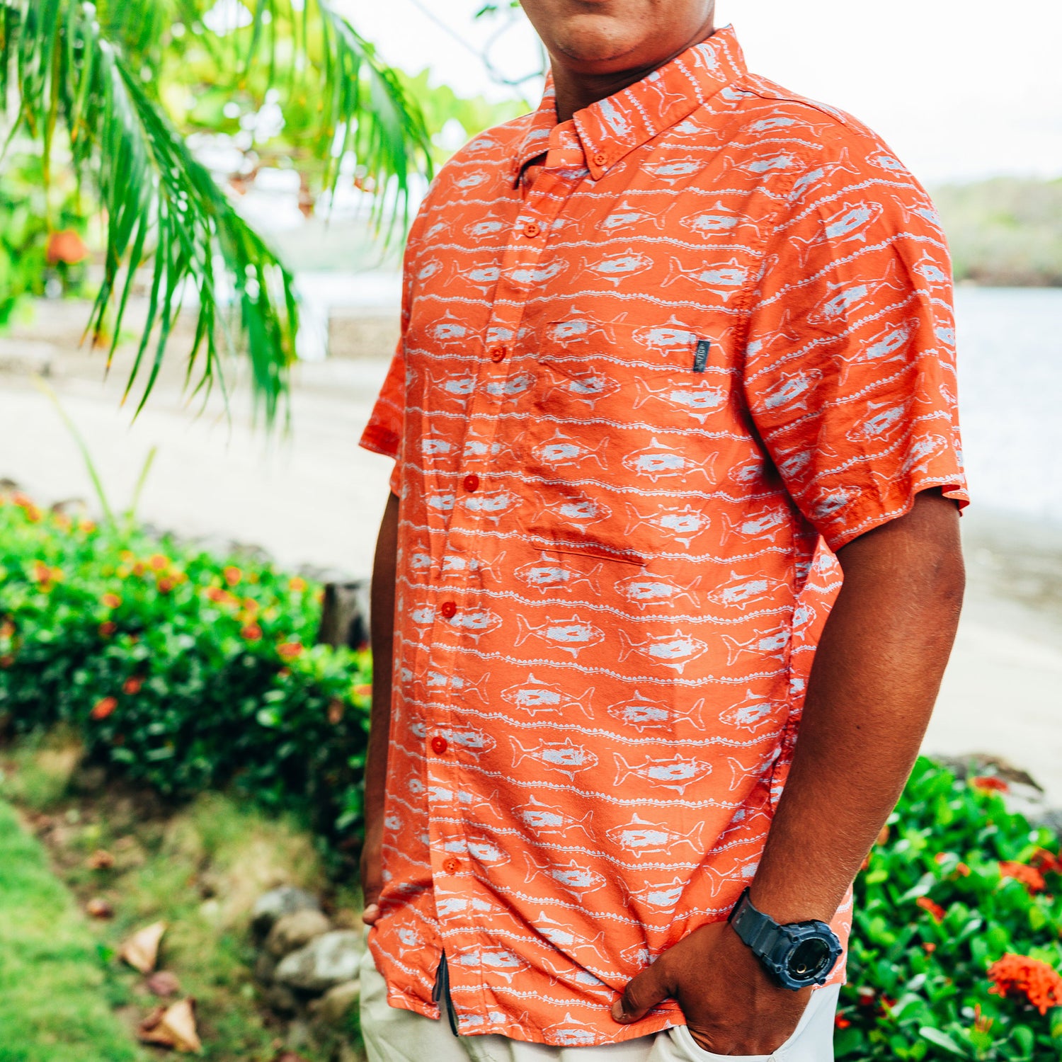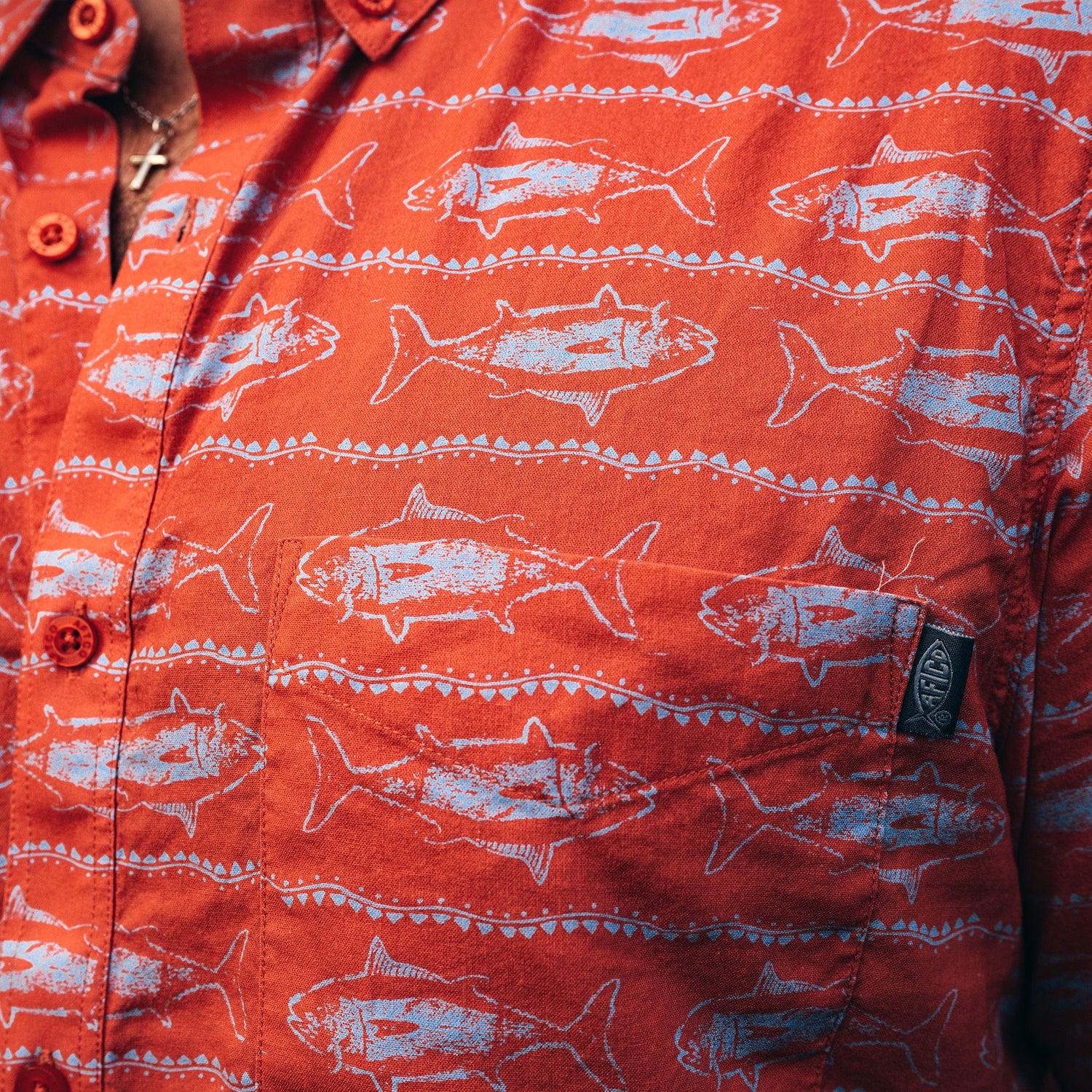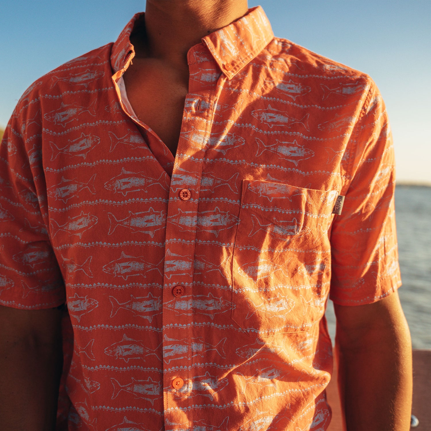 The Boat Bar fish print shirt brings the good vibes everywhere you go. Its tropical colorways and fish prints help anglers stand out from the crowd on the boat and at the bar. This classic fit button-down fishing shirt has UPF 50 sun protection, collar stay buttons, and a chest pocket.