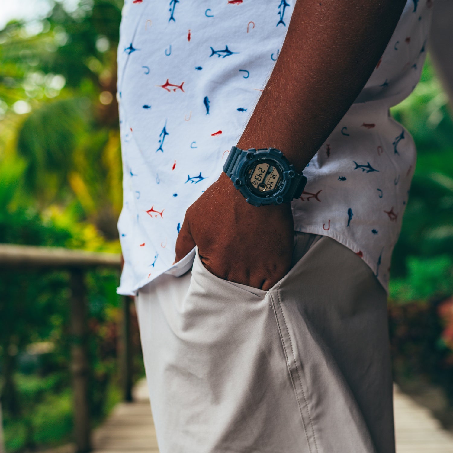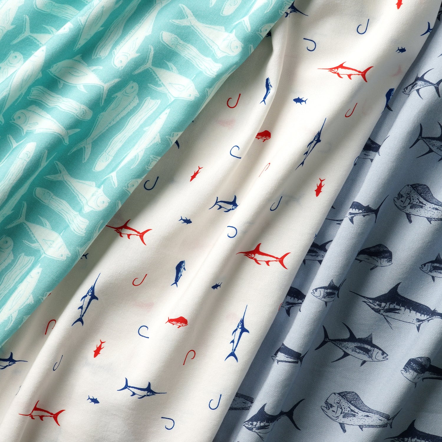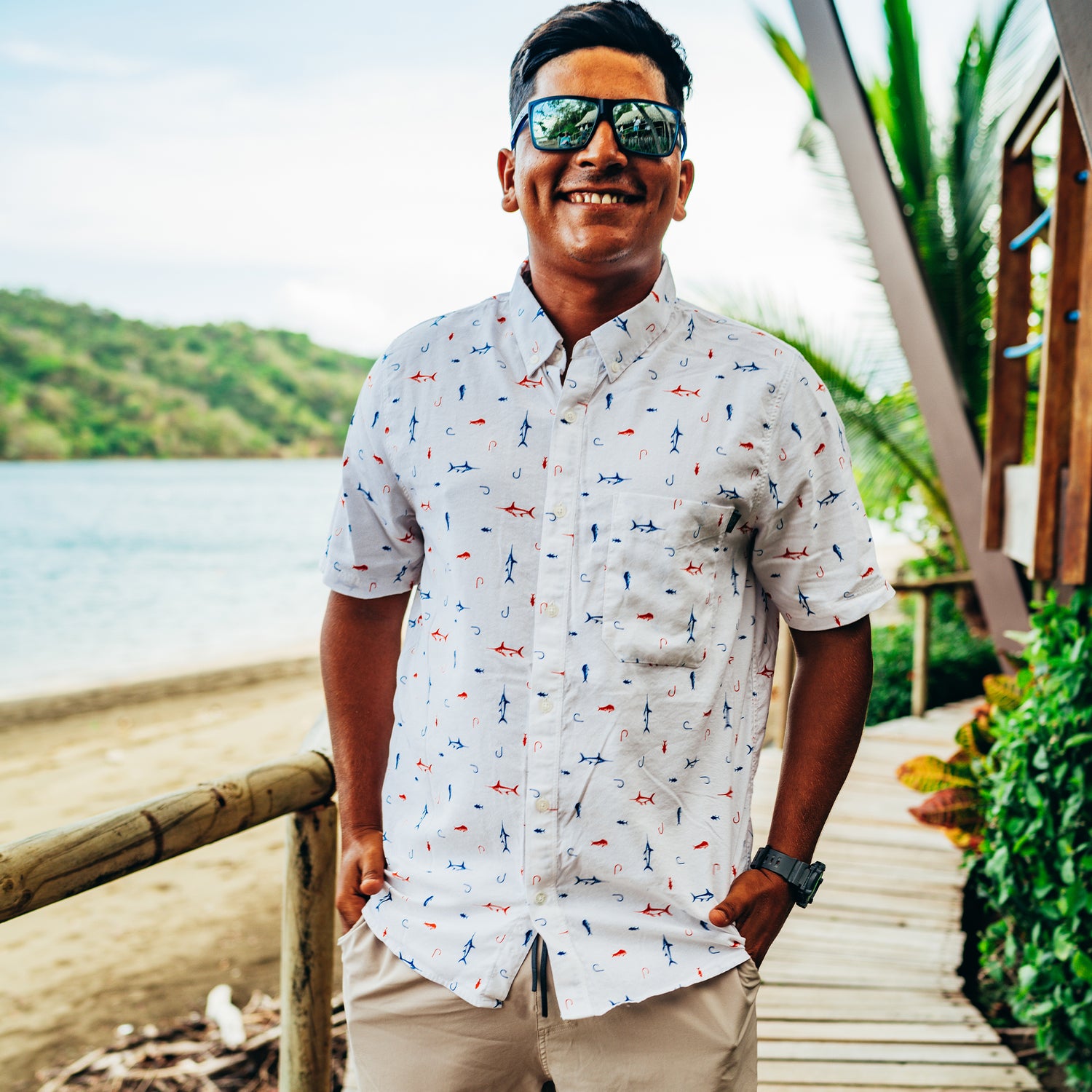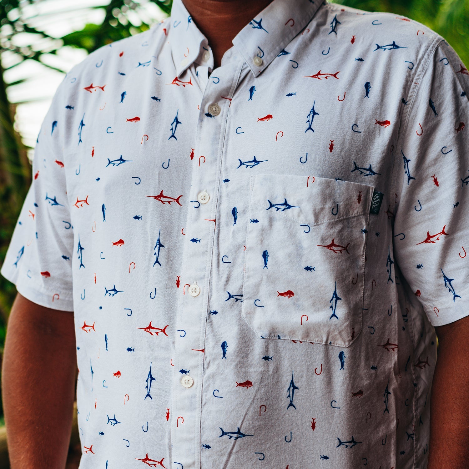 The Boat Bar fish print button-down shirt puts anglers in an island state of mind. It transitions seamlessly from a leisurely boat ride to a beachside bar. It’s a men’s fishing shirt with a classic fit and UPF 50 sun protection so that anglers can enjoy their time on the water sunburn-free. The white Boat Bar features a red and blue marlin print.
