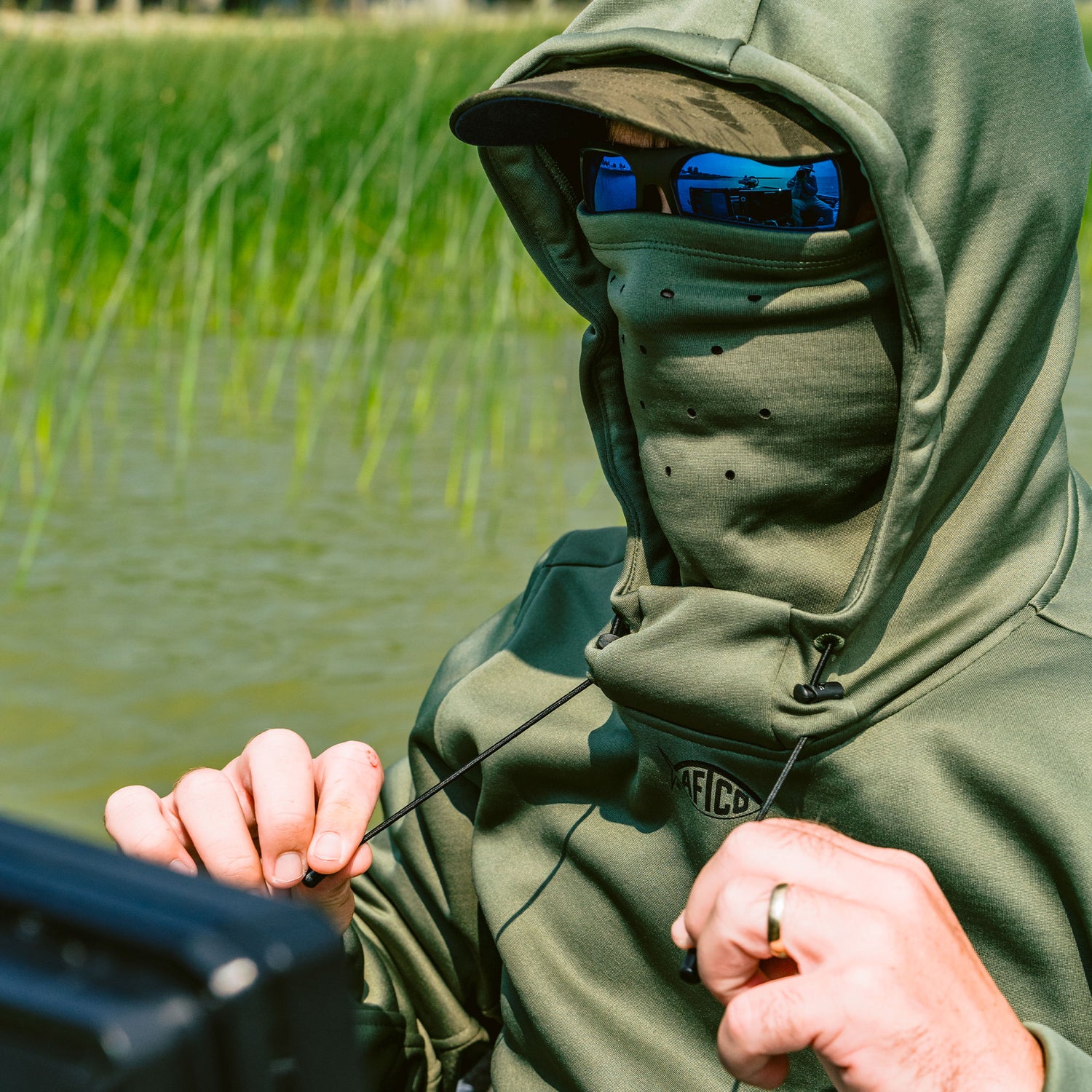 Constructed with an insanely comfortable and warm microfleece fabric, the AFTCO Reaper Sweatshirt features a specially designed built-in face mask and neck warmer. This men's technical hoodie delivers with specialized features like laser cut ventilation on the mask and underarm area, a convenient hood anchoring system designed for high-speed runs across the channel or lake, and ultra-quiet pocket enclosures for added stealth. Reaper is truly the best fishing sweatshirt a fisherman can find. Whether worn standalone or as a crucial layering piece, Reaper is the go-to when warmth is paramount. View all Reaper styles here.