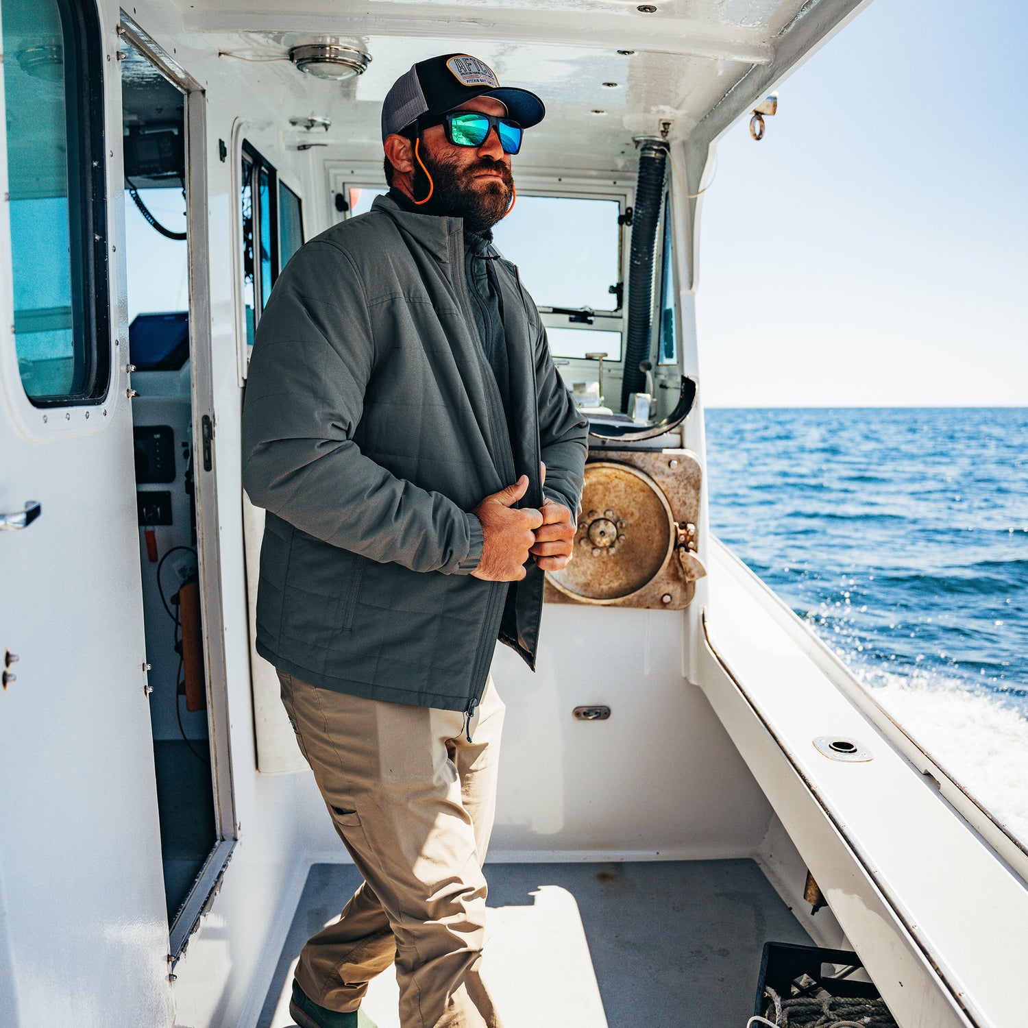 This fishing jacket has everything you need to stay protected from the elements. It is wind resistant, DWR water repellent, and durable to last wear after wear. It features a zipper chest and hand pockets for easy storage. The Crosswind Puff Jacket has a woven label and a classic fit, making it a staple for cold weather.