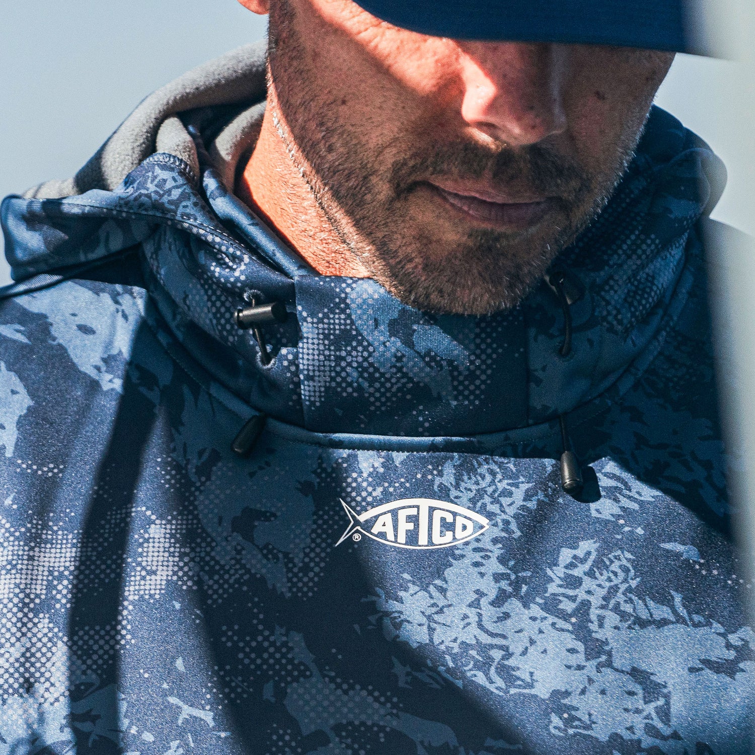 The Reaper Camo Sweatshirt. Every angler's favorite pullover fishing sweatshirt offered in custom AFTCO camo patterns. Constructed with an insanely comfortable and warm microfleece fabric, this men's sweatshirt features a specially designed built-in face mask and neck warmer. Reaper is a technical hoodie that delivers with specialized features like laser cut ventilation on the mask and underarm area, a convenient hood anchoring system designed for high-speed runs across the channel or lake, and ultra-quiet pocket enclosures for added stealth.